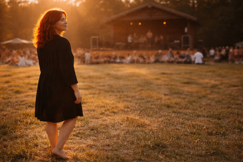 Den pálil. Slunce mělo tu srpnovou intenzitu, kdy se neschováš ani ve stínu, kdy se vzduch třese nad asfaltem a tráva voní jako by se vzdávala. Festival byl malý, pořádný, s dřevěným pódiem a stoly rozházenými po louce. Laura si sundala tenisky a šlápla bosýma nohama do trávy. Bylo to příjemné až nečekaně.